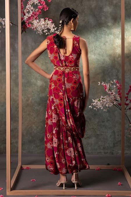 Pink peplum top featuring a blunt V neck and floral print with pleated detailing. Paired with a dhoti pant and a detachable drape, accented by an embroidered belt.