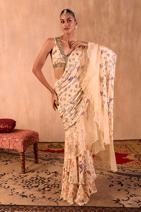 Ivory floral pre-draped saree featuring organza ruffle edging and delicate gold hand embroidery. Paired with an embroidered blouse made from crepe and organza fabric.