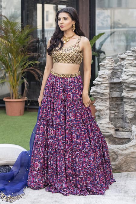 Buy_Mehak Murpana_Multi Color Crepe, Dupatta Organza Zigzag Leaf Neck Printed Tiered Lehenga Set_Online_at_Aza_Fashions