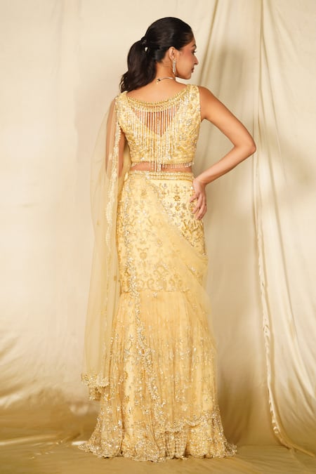 Buy_Mehak Murpana_Gold Net, Linen Beads, Sequins, Cut Work Cutdana Embroidered Fishcut Lehenga Set _Online_at_Aza_Fashions