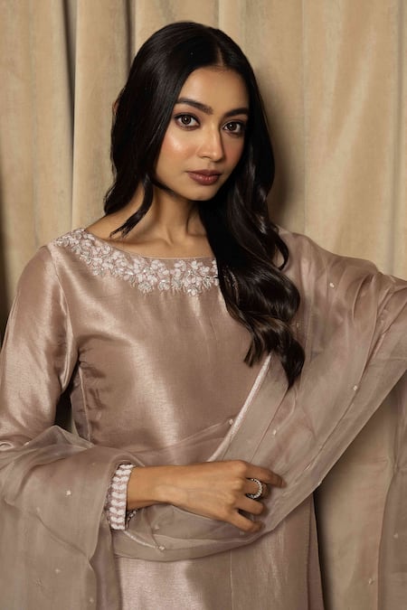 Pink Silk, Organza, Bamboo Embroidery, Gota Patti Boat Placement Kurta Pant Set