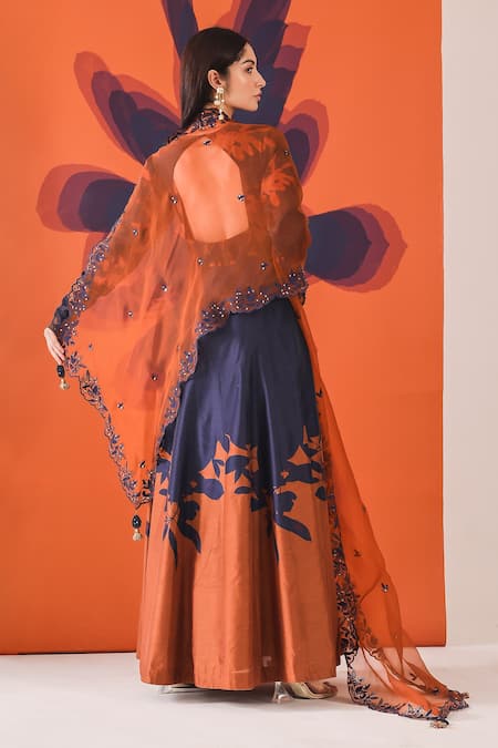 Blue chanderi anarkali with red color block print, floral pattern embellished bodice, churidar sleeves & front polti buttons. Paired with contrast dupatta with embroidery.