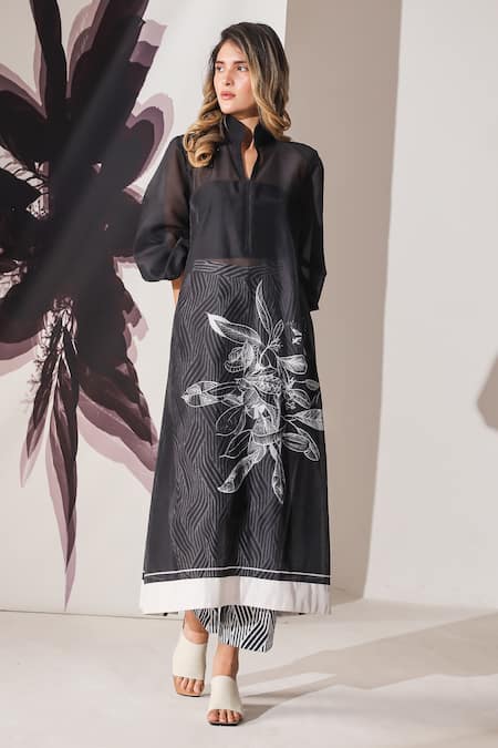 Buy_Mehak Talreja Couturre_Black Chanderi Printed Floral And Geometric Mandarin Kurta & Pant Set  _Online_at_Aza_Fashions