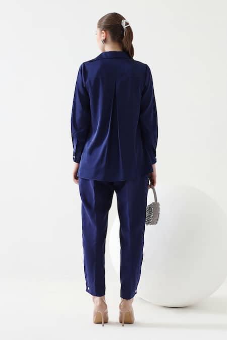Blue draped shirt featuring floral embroidery and a shirt collar, paired with a crepe pant. The set includes an inner layer made of Lycra.