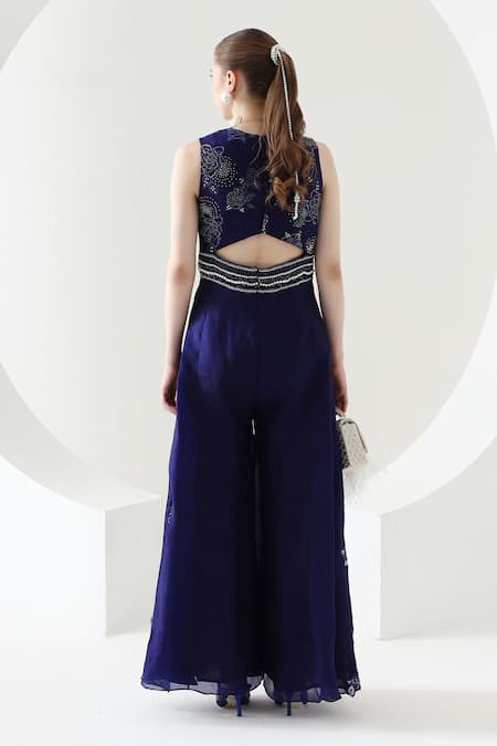 Dark blue flared jumpsuit featuring an embroidered yoke and transparent embellished side kalis with a back cut on the waist