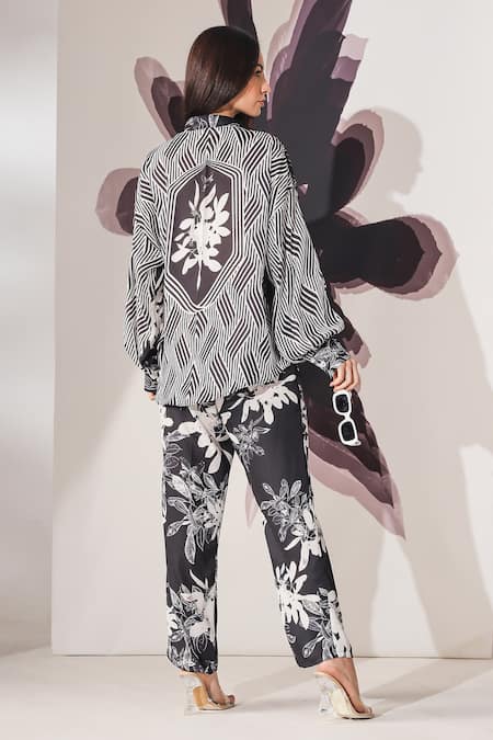 Buy_Mehak Talreja Couturre_Black Crepe Floral, Geometric Shirt Collar Printed And Pant Set _at_Aza_Fashions
