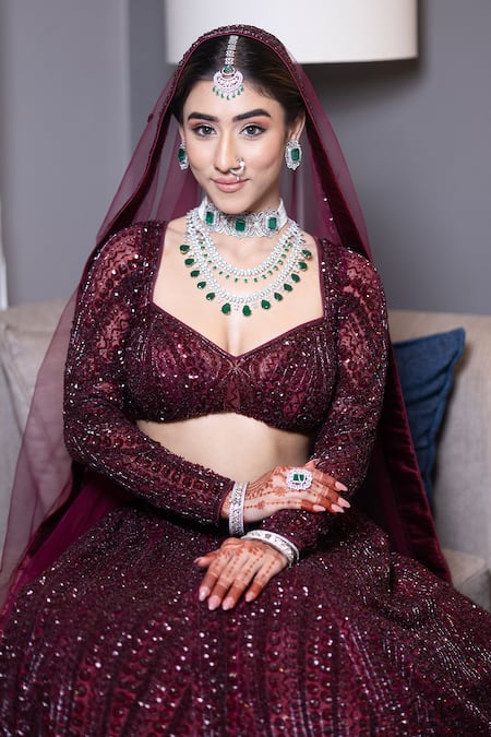 Maroon lehenga featuring intricate sequin and stone embroidery. Paired with a padded embroidered blouse and an embroidered dupatta.
