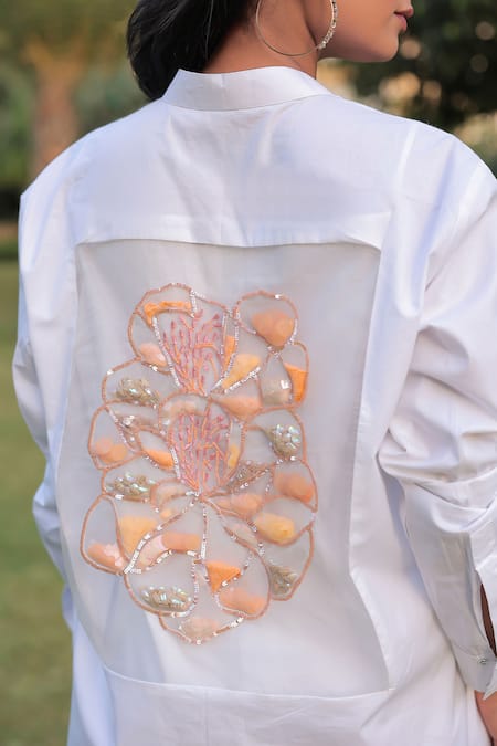 White shirt featuring full sleeves, collared neck, and floral sequin embroidery on the patch pocket and back. Paired with coordinating pants that complement the shirt's design.