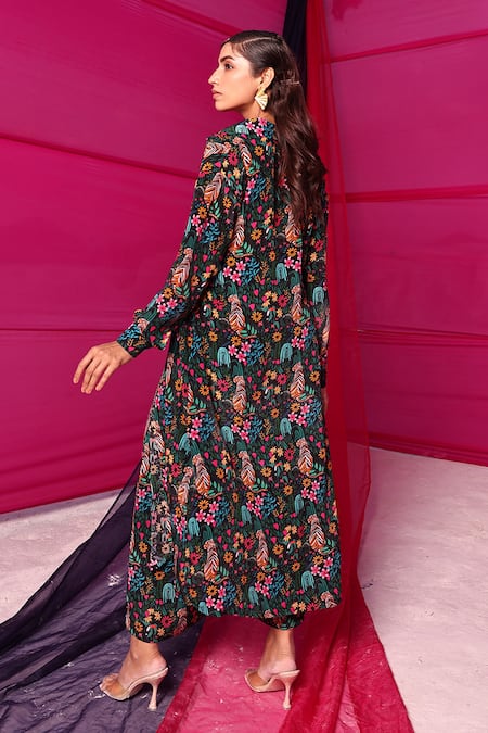 Black shirt tunic featuring a vibrant Jungle Safari print with full sleeves and a collar neckline. Paired with coordinating printed pant and attached lining.