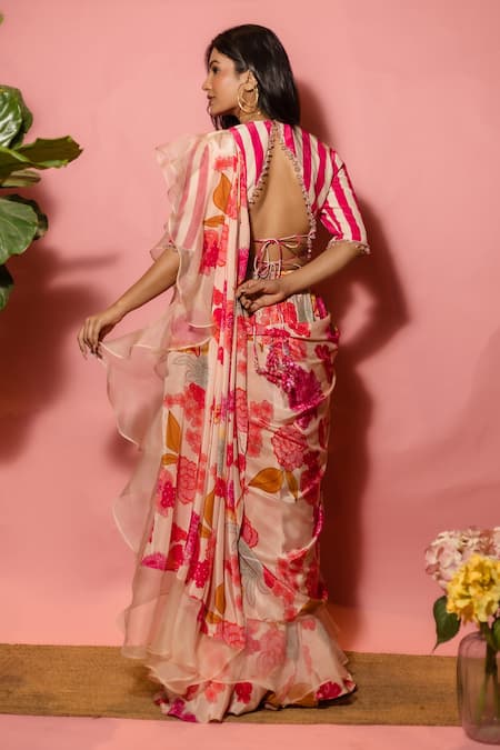 Tassels on the saree, Padded blouse for added comfort, Stripes on the blouse with floral print saree