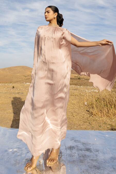 Beige cape featuring a band collar and bead embellishments at the neckline. Paired with a relaxed-fit pant for a complete look.