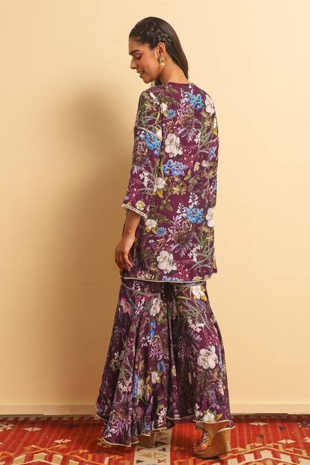 Wine kurta with floral print, lace detail & embroidered bodice. Paired with printed gharara & printed hem dupatta.