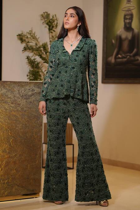 Shop_Mehul Gupta_Green Lace Embroidery Beads Spread Gardenia Peplum Top With Bell Bottom Trouser_Online_at_Aza_Fashions