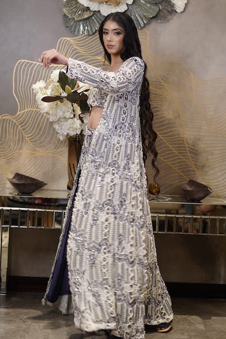 Buy_Mehul Gupta_Ivory Lace Sequins, Pearls, Beads Embellished Bloom Jacket Flared Pant Set _at_Aza_Fashions