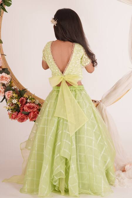 Buy_Mei & ZU_Green Organza, Georgette, Cotton Embroidery, Sequins, Pearls Layered Lehenga Set