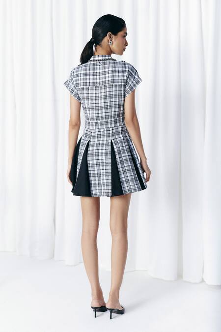 Black Cotton Collared Check And Solid Panel Studded Dress