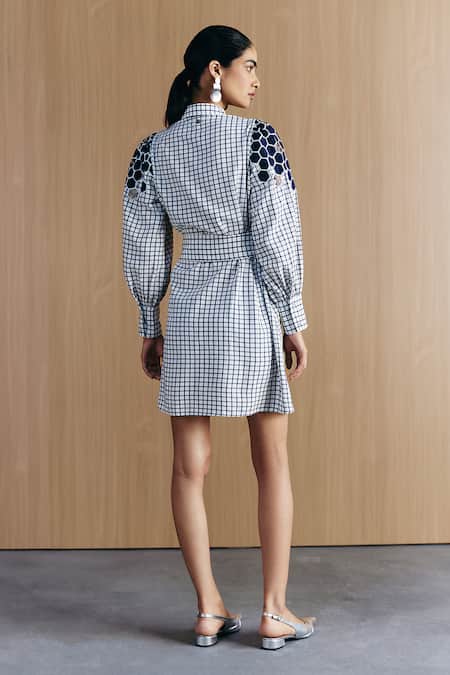 Blue and white check embellished shirt dress featuring a structured silhouette and puff sleeves