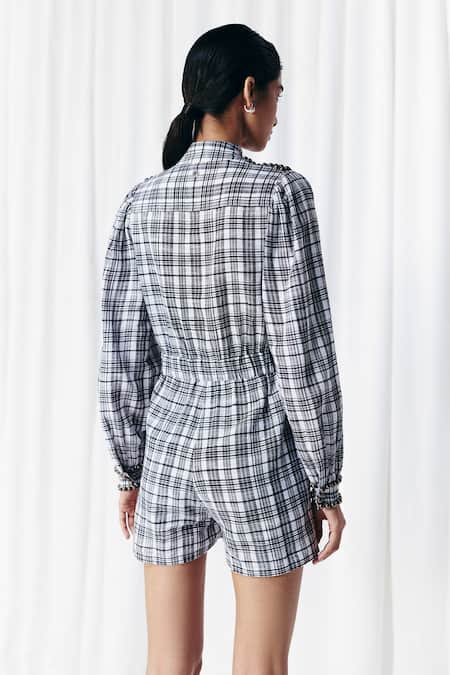 Black and white check studded playsuit featuring a collared neckline and long sleeves