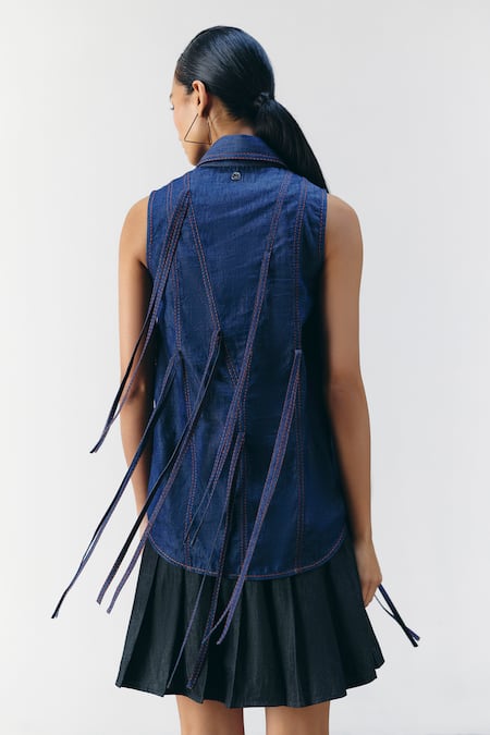 Blue Cotton Fringe Collared Denim Shirt