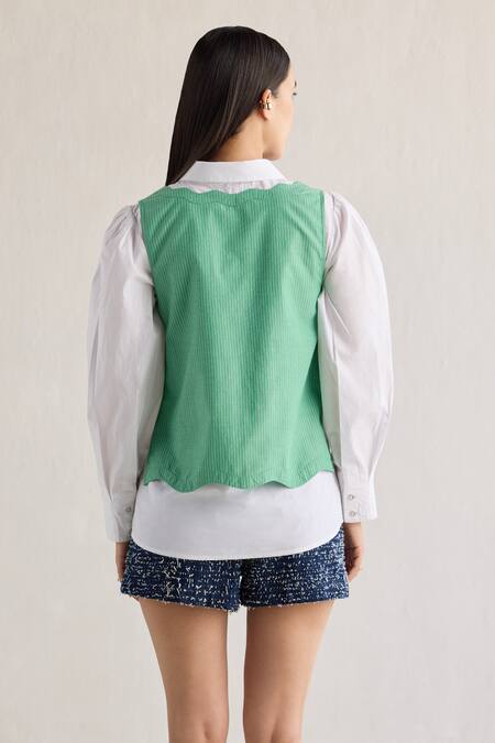 Green and white striped shirt featuring voluminous sleeves and a collar neck