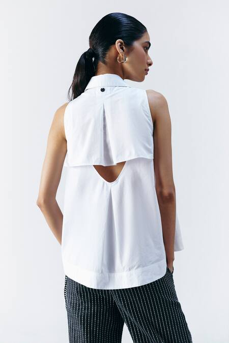 White shirt featuring feather embellishments and a front lining