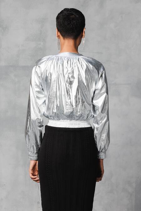 Silver Cotton Round Neck Foil Effect Bomber Jacket