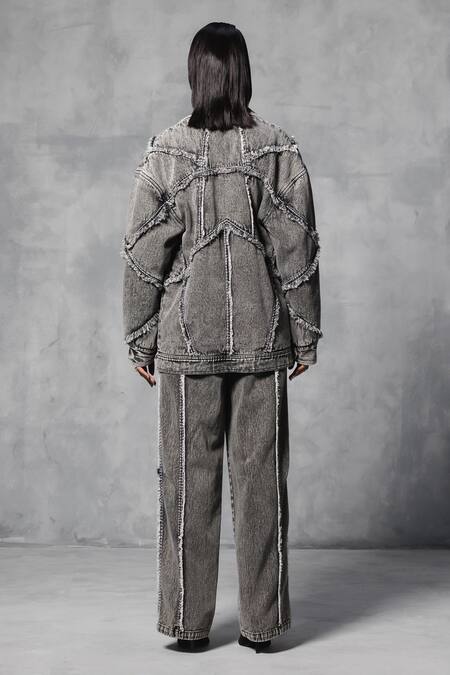 Black oversized washed jacket crafted in 100% cotton denim featuring contrast stitch embroidery and raw edge detail. Paired with matching wide-legged pant.