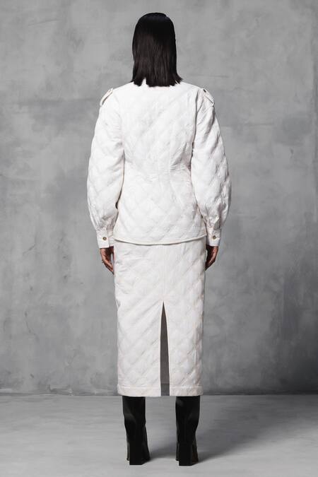 White quilted jacket featuring voluminous sleeves and a collar. Paired with a coordinating quilted skirt with a subtle back slit.