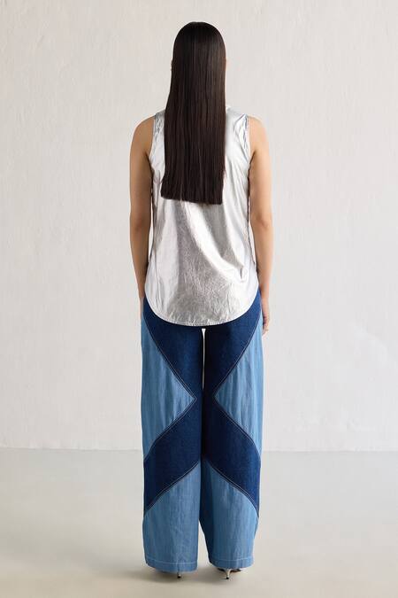 Silver Cotton Round Neck Sunray Weave Panelled Foil Top