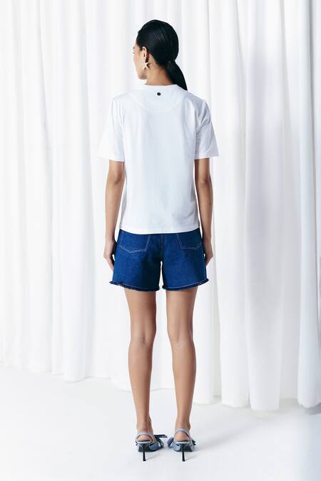 Blue Cotton Fringe Washed Denim Shorts