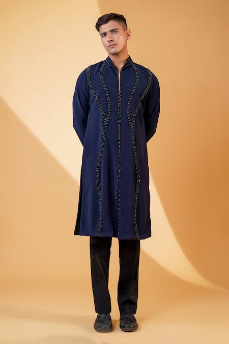 Blue kurta featuring bead embroidery along the front and a short zip opening. Paired with a matching pant for a complete look.