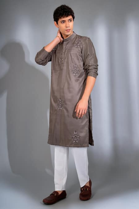 Brownish grey kurta featuring full sleeves, band collar, and damask embroidery with dabka and Swarovski stones. Paired with a white pant, this set is crafted from pure dupion silk with an attached lining.