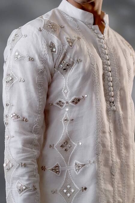 White kurta featuring intricate dori work all over. Paired with straight pants for a complete look.