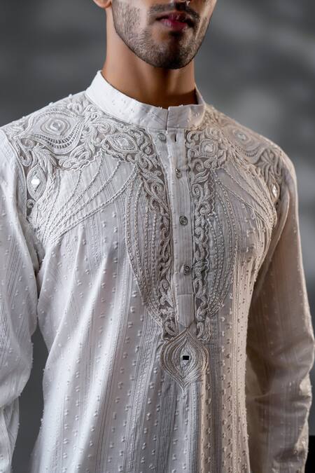White kurta featuring embossed fringe thread work and a band collar. Paired with straight pants for a complete look.