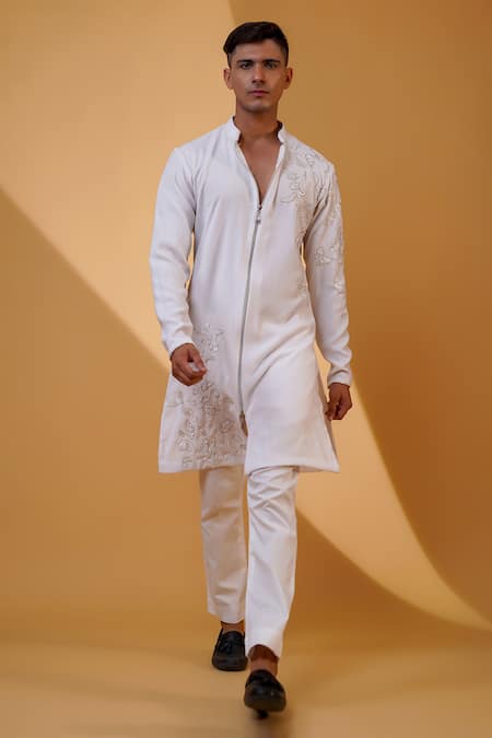 White kurta featuring floral pita and dabka work with a front short zip. Paired with smart fit pants for a complete look.