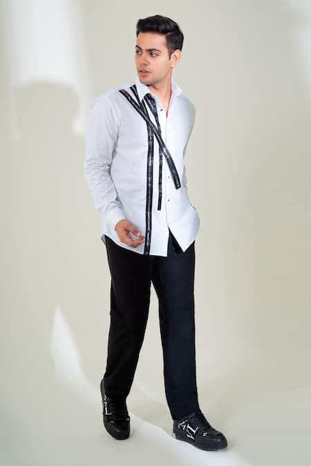 Satin tape embellishments along the front panel, Full sleeves with buttoned cuffs, Collared neckline