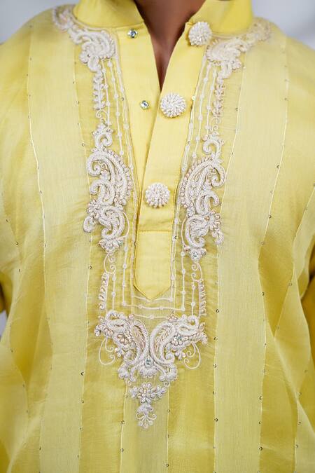 Yellow kurta featuring anchor thread embroidery along the placket and sequin work throughout. Paired with a loose fit pyjama for a complete look.