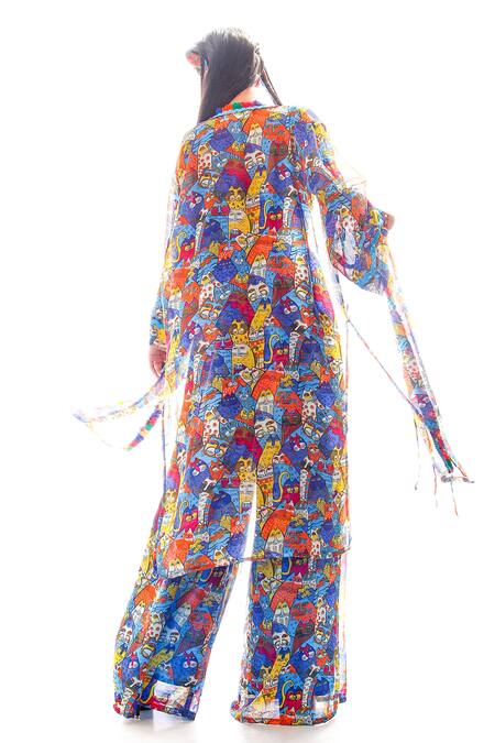 Blue Georgette Cat Motifs Blouse Scoop Meow Print Palazzo Set With Cape