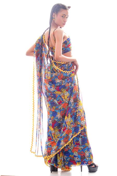 Blue pre-stitched pleated pant saree with cat motif prints & contrast ric rac lace trims. Paired with ruched bustier with buckled straps.