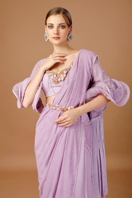 Purple draped saree featuring a floral embroidered blouse with ruffle sleeves. Accompanied by a chiffon and georgette saree skirt and pallu with sequins and shell embellishments.