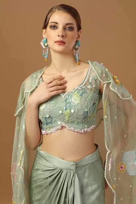 Green embroidered skirt featuring ruffle drapes and frill hem. Paired with a sleeveless leaf neckline blouse and a sheer organza shrug adorned with multi-colored floral appliques.