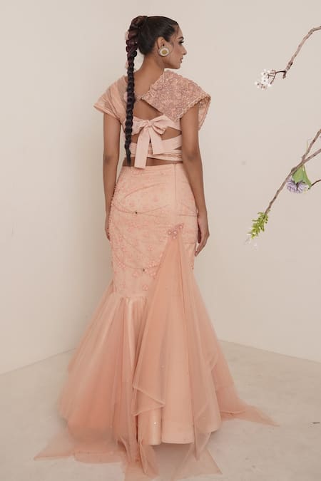 Peach net fish cut lehenga with multicolor stone, sequin, pearl floral embroidery. Comes with broad shoulder padded blouse & detachable waist belt.