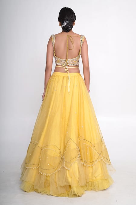 Buy_Merge Design_Yellow Organza, Net, Crepe Embroidery, Sequins Round Neck Layered Lehenga Set _Online_at_Aza_Fashions