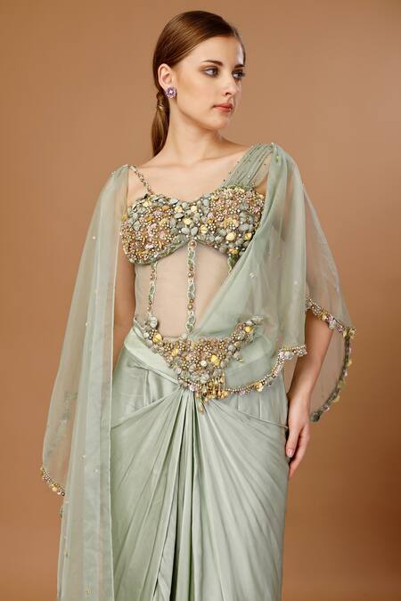 Green pre-draped saree featuring placement embroidery and scallop borders. Paired with a multicolor corset adorned with shell, pearl, and sequin work, along with a sheer organza dupatta.