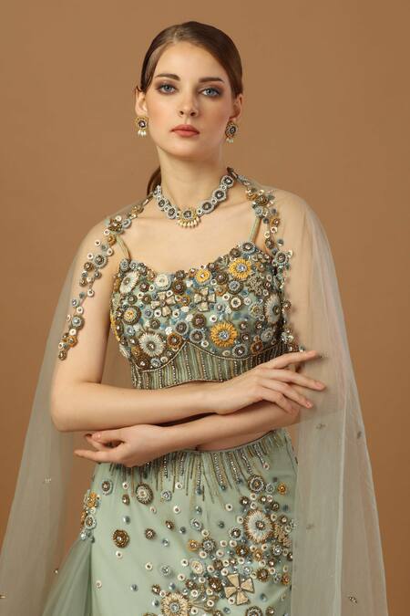 Aqua green fish cut lehenga featuring floral embroidery and a six meter ghera. Paired with a spaghetti strap embroidered blouse and a matching dupatta.