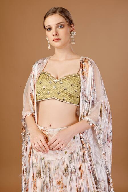 Peach floral print skirt featuring an attached cancan and ruffle borders. Paired with a pearl embellished olive green blouse and an open shrug with flared sleeves.