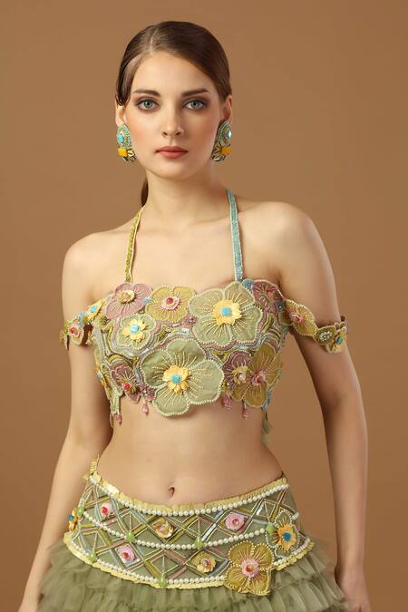 Green lehenga featuring layered frills and embroidered waistband. Paired with a floral applique work halter neck blouse adorned with 3D florals.