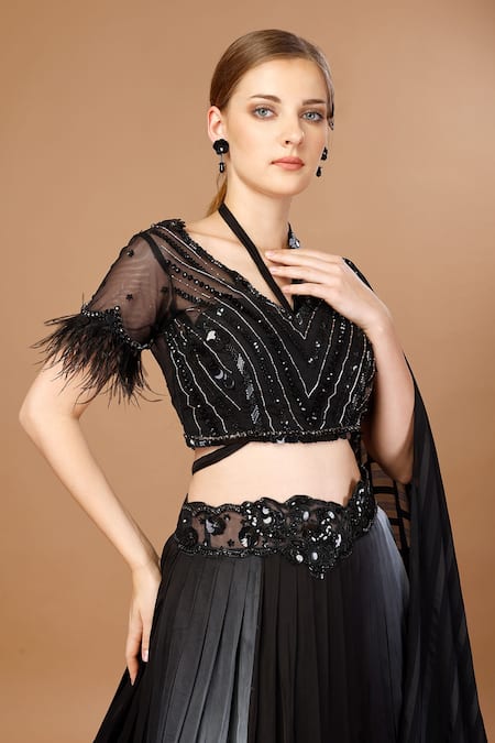 Black lehenga featuring pleated design and an embroidered waistband. Paired with a halter neck blouse made of sheer net and a striped dupatta.