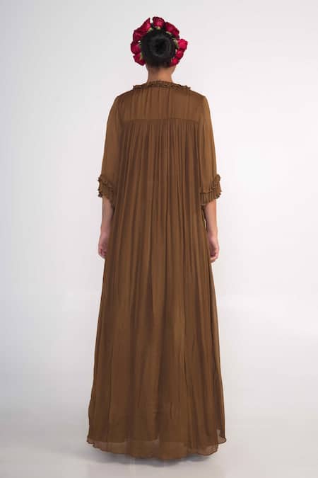 Buy_Merge Design_Brown Chiffon, Crepe, Georgette Beads, Cut Work, Pleated Shrug And Flared Pant Set _at_Aza_Fashions