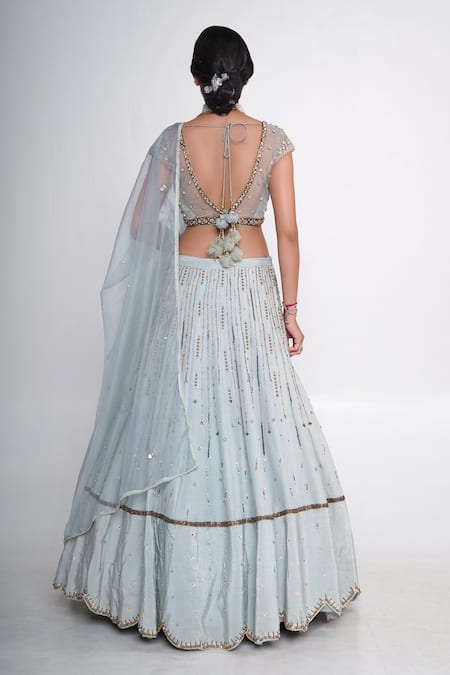 Blue Silk, Organza, Crepe Sequins, Pearls, Embroidery Scalloped Hem Lehenga Set